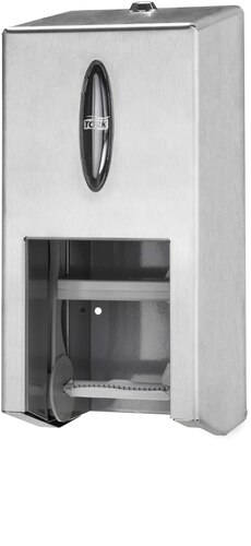 T7 rendszer, rozsdamentes acél, kulccsal zártható. A duplatekercses adagolóban 9 hagyományos tekercsnek megfelelő mennyiség tárolható, mely csökkenti az utánöltés gyakoriságát és biztosítja, hogy a toalettpapír mindig rendelkezésre álljon. Méretek: magasság: 325 mm, szélesség: 149 mm, mélység: 143 mm.